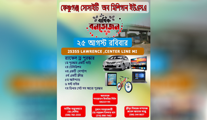 যুক্তরাষ্ট্রের মিশিগানে বসবাসরত ফেঞ্চুগঞ্জ উপজেলাবাসীর ঐতিহ্যবাহী সংগঠন ‘ফেঞ্চুগঞ্জ সোসাইটি অব মিশিগান’-এর বার্ষিক বনভোজন ২৫ আগস্ট রোববার অনুষ্ঠিত হবে।