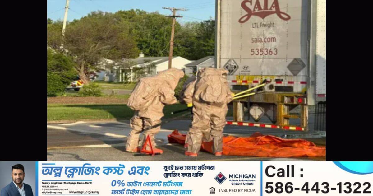 লিভোনিয়া ও ফার্মিংটন হিলসের সীমান্তবর্তী এলাকায় একটি সেমিট্রাক্টর-ট্রেলার থেকে বিপজ্জনক রাসায়নিক পদার্থ ফেরিক ক্লোরাইড লিক হওয়ার ঘটনা ঘটে। গত সোমবার (১৯ মে) বিকেলে জরুরি সাড়া প্রদানকারী দল হস্তক্ষেপ করেছে। ঘটনার পরপরই হ্যাজার্ডাস মেটেরিয়ালস (হ্যাজম্যাট) ইউনিট ঘটনাস্থলে পৌঁছে তৎপরতা শুরু করে।