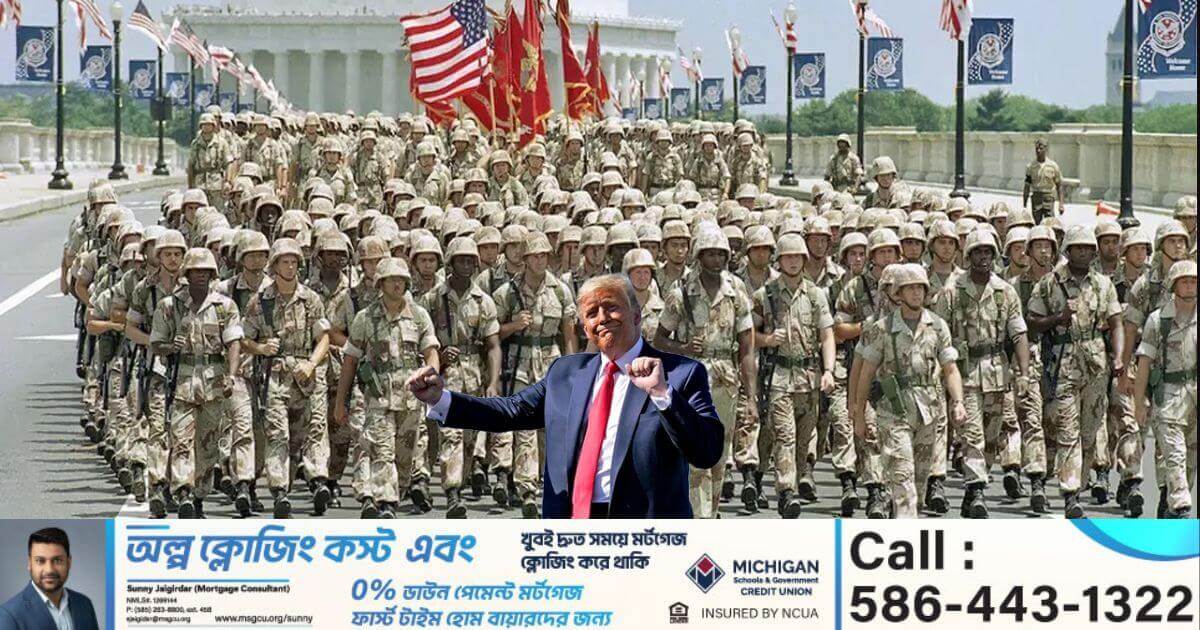 ডোনাল্ড ট্রাম্পের জন্মদিন ও যুক্তরাষ্ট্র সেনাবাহিনীর ২৫০তম প্রতিষ্ঠাবার্ষিকী উপলক্ষে ওয়াশিংটনে একটি বিশাল সামরিক কুচকাওয়াজের আয়োজন করতে যাচ্ছেন ট্রাম্প। এই কুচকাওয়াজে অংশ নিতে পারে ৬,৬০০ জনেরও বেশি সৈনিক, ১৫০টিরও বেশি সামরিক যান, ৫০টি হেলিকপ্টার, ৭টি ব্যান্ড দল এবং হাজারখানেক সাধারণ মানুষ।