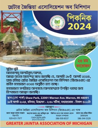 যুক্তরাষ্ট্রের মিশিগানে বসবাবসরত জৈন্তাপুর, গোয়াইনঘাট, কানাইঘাট ও কোম্পানীগঞ্জবাসীর ঐতিহ্যবাহী সংগঠন গ্রেটার জৈন্তিয়া এসোসিয়েশন অব মিশিগান-এর ২৩তম বার্ষিক বনভোজন আগামী ১৮ আগস্ট রোববার অনুষ্ঠিত হবে। বনভোজনটি ওয়ারেনস্থ সো পার্কে অনুষ্ঠিত হবে। বনভোজনে নির্দিষ্ট সময়ে সপরিবারে উপস্থিত থাকার জন্য আমন্ত্রণ জানিয়েছেন গ্রেটার জৈন্তিয়া এসোসিয়েশন অব মিশিগান-এর সভাপতি আবুল কালাম আজাদ এবং সাধারণ সম্পাদক খাজা আফজাল হোসেন।