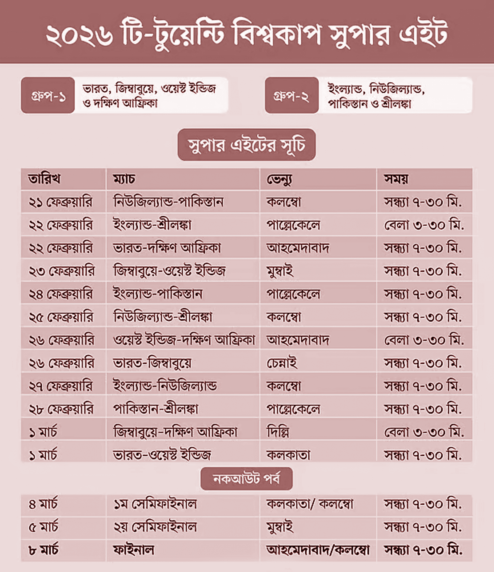 টি–টুয়েন্টি বিশ্বকাপ সুপার এইটে কোন দল কার বিপক্ষে খেলবে, কখন খেলবে