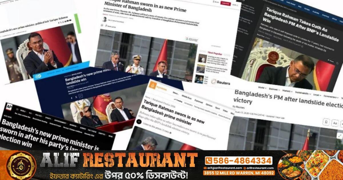 কাতারভিত্তিক সংবাদমাধ্যম আলজাজিরা শিরোনাম করেছে, ‘বাংলাদেশের নতুন প্রধানমন্ত্রী হিসেবে শপথ নিয়েছেন তারেক রহমান’। পাকিস্তানের প্রভাবশালী পত্রিকা ডন লিখেছে, ‘বাংলাদেশের নতুন প্রধানমন্ত্রী, রাজনৈতিক উত্তরাধিকারী তারেক রহমান’। তাদের প্রতিবেদনে বলা হয়, দীর্ঘদিন ধরে মা-বাবার রাজনৈতিক প্রভাবের আড়ালে থাকা এবং দেশের অন্যতম প্রভাবশালী রাজনৈতিক পরিবারের উত্তরাধিকারী হিসেবে পরিচিত তারেক রহমান অবশেষে সরাসরি রাজনৈতিক অঙ্গনে সামনে এলেন।
