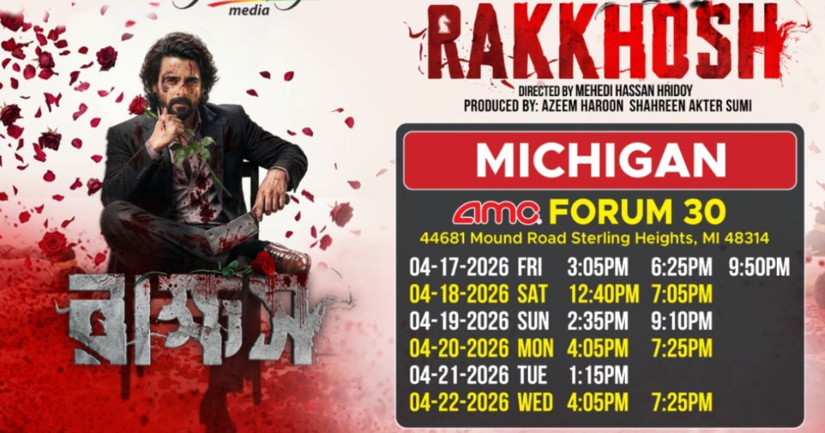মিশিগানে প্রবাসী দর্শকদের জন্য বহুল প্রতীক্ষিত বাংলা চলচ্চিত্র Rakkhosh প্রদর্শনীর সময়সূচি ঘোষণা করা হয়েছে। যুক্তরাষ্ট্রের মিশিগান অঙ্গরাজ্যের স্টার্লিং হাইটস এলাকায় অবস্থিত এএমসি ফোরাম ৩০-এ ছবিটি প্রদর্শিত হবে।