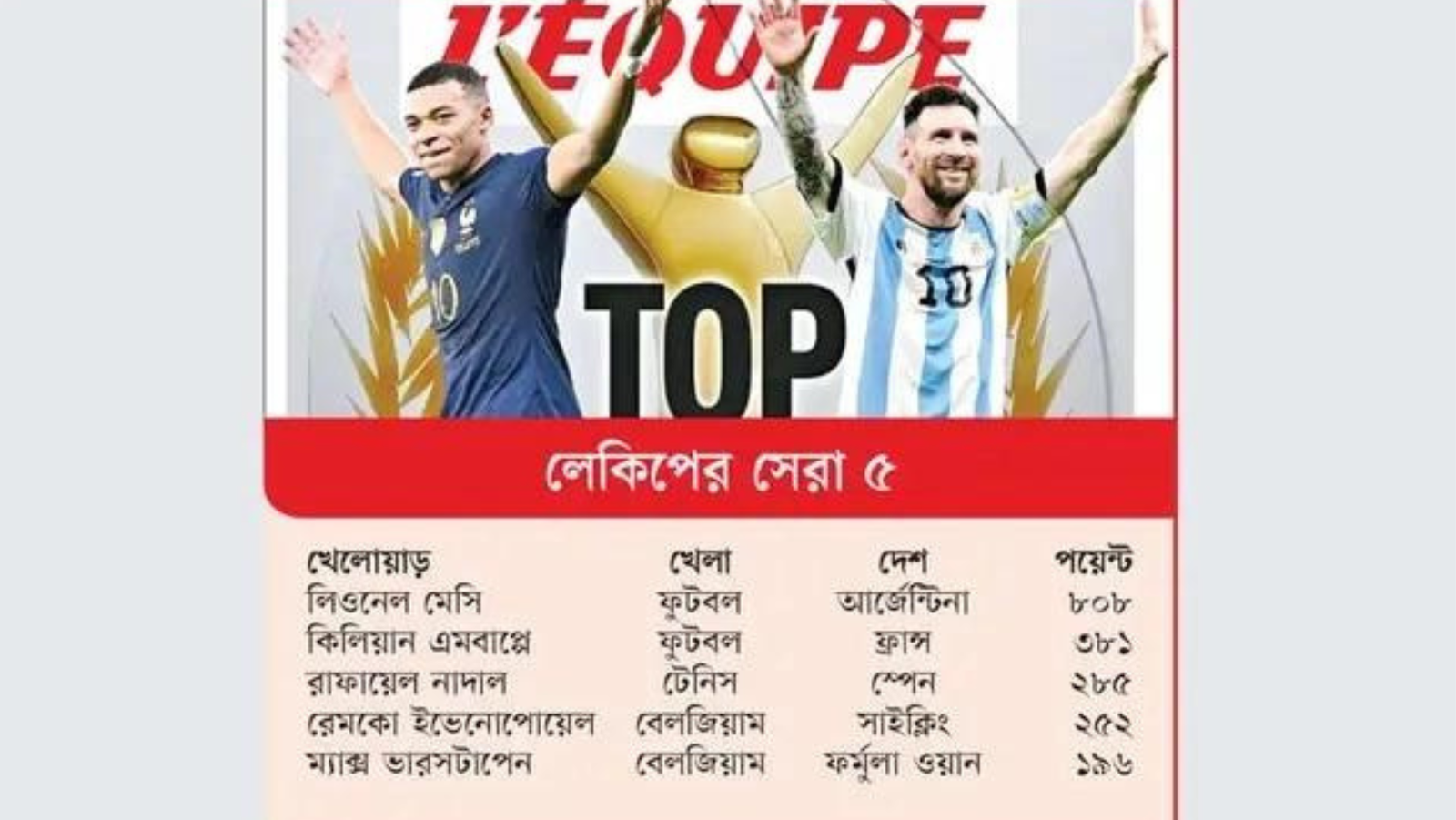সেরাদের সেরা হওয়া খেলোয়াড়টিকে নিয়ে প্রচ্ছদ করে থাকে লেকিপ। তবে এবার মেসির পাশাপাশি তারা রেখেছে এমবাপ্পেকেও। এ ছাড়া গত বছর দুটি গ্র্যান্ড স্লাম জেতা রাফায়েল নাদাল তৃতীয়, বেলজিয়ামের সাইক্লিস্ট রেমকো ইভেনোপোয়েল চতুর্থ আর বেলজিয়ামেরই ফর্মুলা ওয়ান রেসিং ড্রাইভার ম্যাক্স ভারসটাপেন হয়েছেন পঞ্চম।