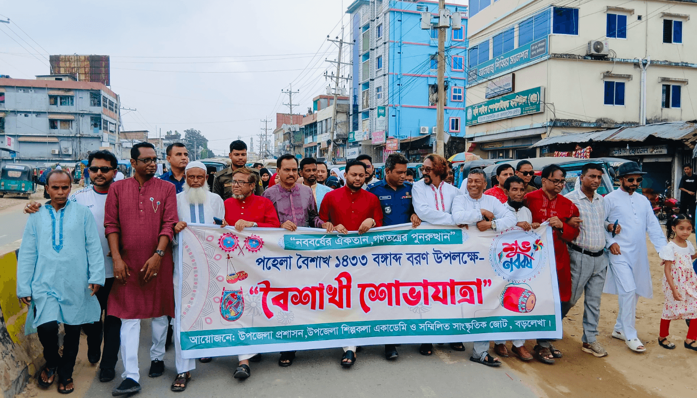মৌলভীবাজারের বড়লেখায় উপজেলা প্রশাসন ও সম্মিলিত সাংস্কৃতিক জোটের উদ্যোগে অনুষ্ঠিত হয়েছে বর্ণাঢ্য বৈশাখী শোভাযাত্রা।মঙ্গলবার (১৪ এপ্রিল) সকাল ১১টায় বড়লেখা বালিকা উচ্চ বিদ্যালয় প্রাঙ্গণ থেকে শোভাযাত্রাটি বের হয়ে উপজেলার বিভিন্ন সড়ক প্রদক্ষিণ করে। এবারের শোভাযাত্রার প্রতিপাদ্য ছিল “নববর্ষের ঐকতান, গণতন্ত্রে